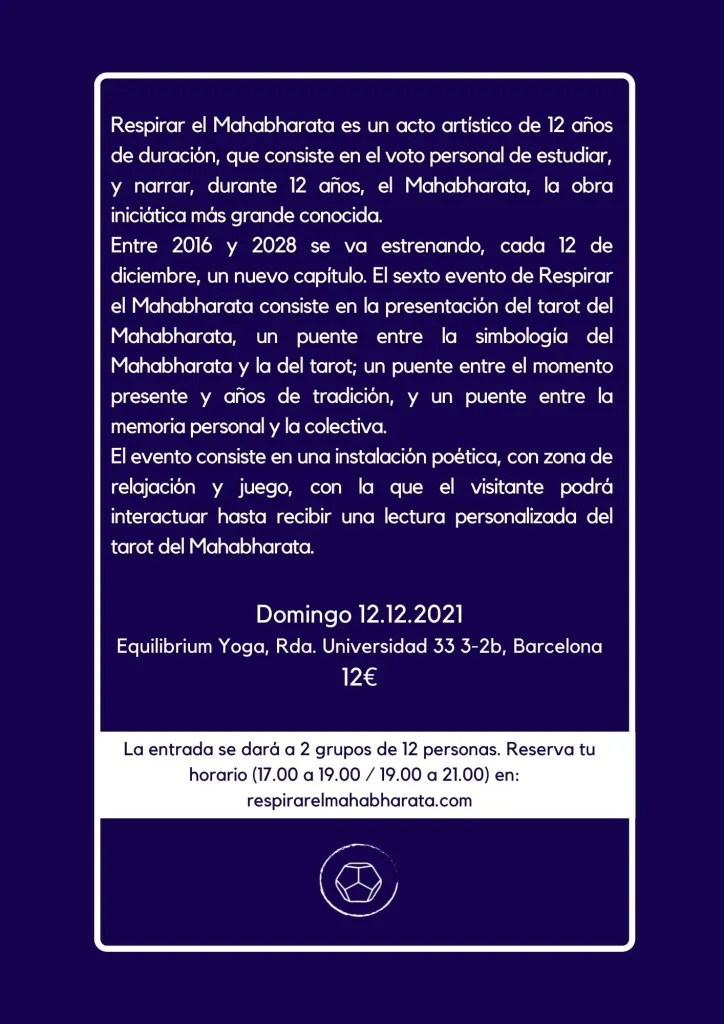 La entrada se dará a dos grupos de 12 personas, uno de 17.00 a 19.00 y otro de 19.00 a 21.00. Puedes elegir tu horario e inscribirte escribiendo a: respirarelmahabharata@gmail.com