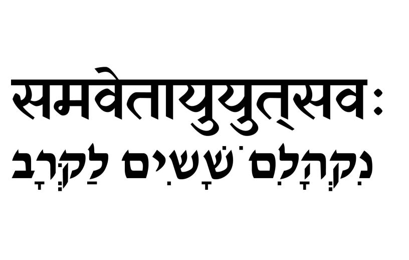 Es importante explicar que el primer verso de la Bhagavad Gita, leído literalmente, está dividido en dos partes: una primera, de ocho sílabas, dice: “en el campo del dharma, en el campo de los Kuru” y una segunda línea, también de ocho sílabas, se puede traducir como: “ansiosos por luchar”. Porque la palabra sánscrita samavetās combina el prefijo sam– usado para significados como junto, juntar o unir, con el participio de la raíz verbal –i, que se usa con significados como llevar a, empujar, impulsar, animar, promover, ofrecer o también defender. La raíz verbal –i (o su derivado –ava) infunde énfasis, vida y movimiento a la palabra con la que forma un compuesto. En este caso la palabra es sama: Una reunión. Una reunión con énfasis. Samaveta: participio pasivo en pasado de sam + ava: Reunidos (pero con ganas, con énfasis), de aquí la acertada traducción hebrea por nikhalim, el pasivo de la raíz kahal, que se usa para designar congregaciones y reuniones de personas.