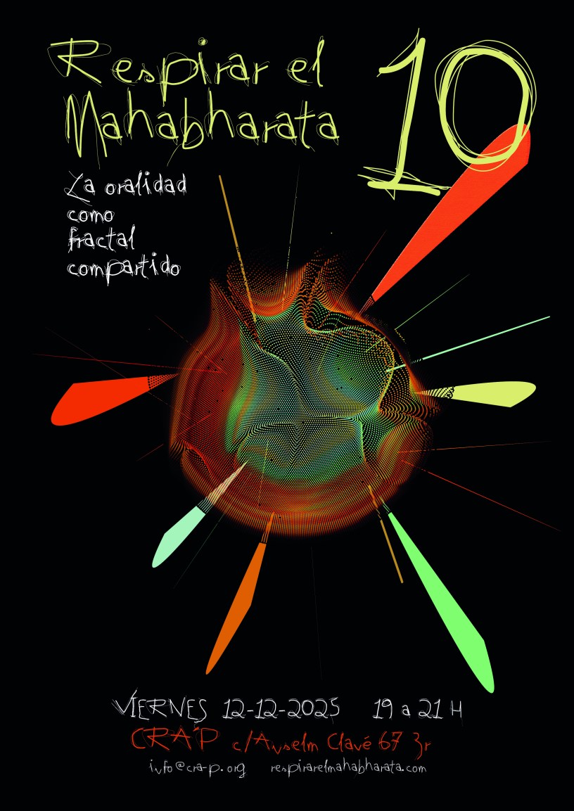 La imagen de esta entrada es el cartel de este décimo año, diseñado por Patricio Mango. Puedes venir el viernes 12 de Diciembre a CRA’P (19.00 a 21.00) para disfrutar de una narración del Mahabharata basada en las preguntas del público. Porque cada fragmento del Mahabharata es un centro, igual que cada uno de nosotros. Inscripción, dirección y más información: aquí.