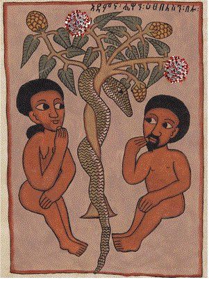 Imágen: Adán y Eva en manuscrito etíope. Por alguna razón no hay información del manuscrito original.